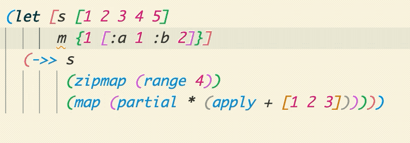 Rewrap | Changes enclosing brackets of the current form to parens/square brackets/curlies/double quotes and set (#{}) ![]() |
