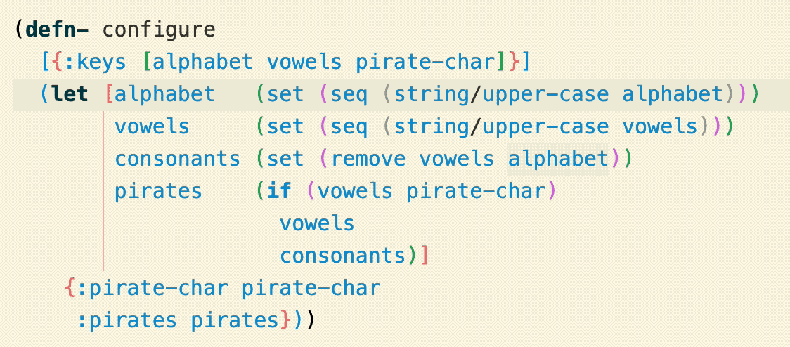 When dragging forms inside maps and binding boxes, such as with let, for, binding, etcetera, it often makes most sense to drag each binding as a pair. And this is what Calva will do. Like so: